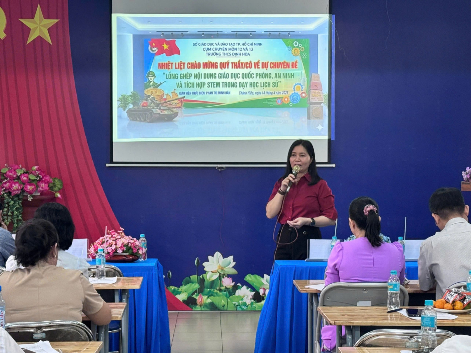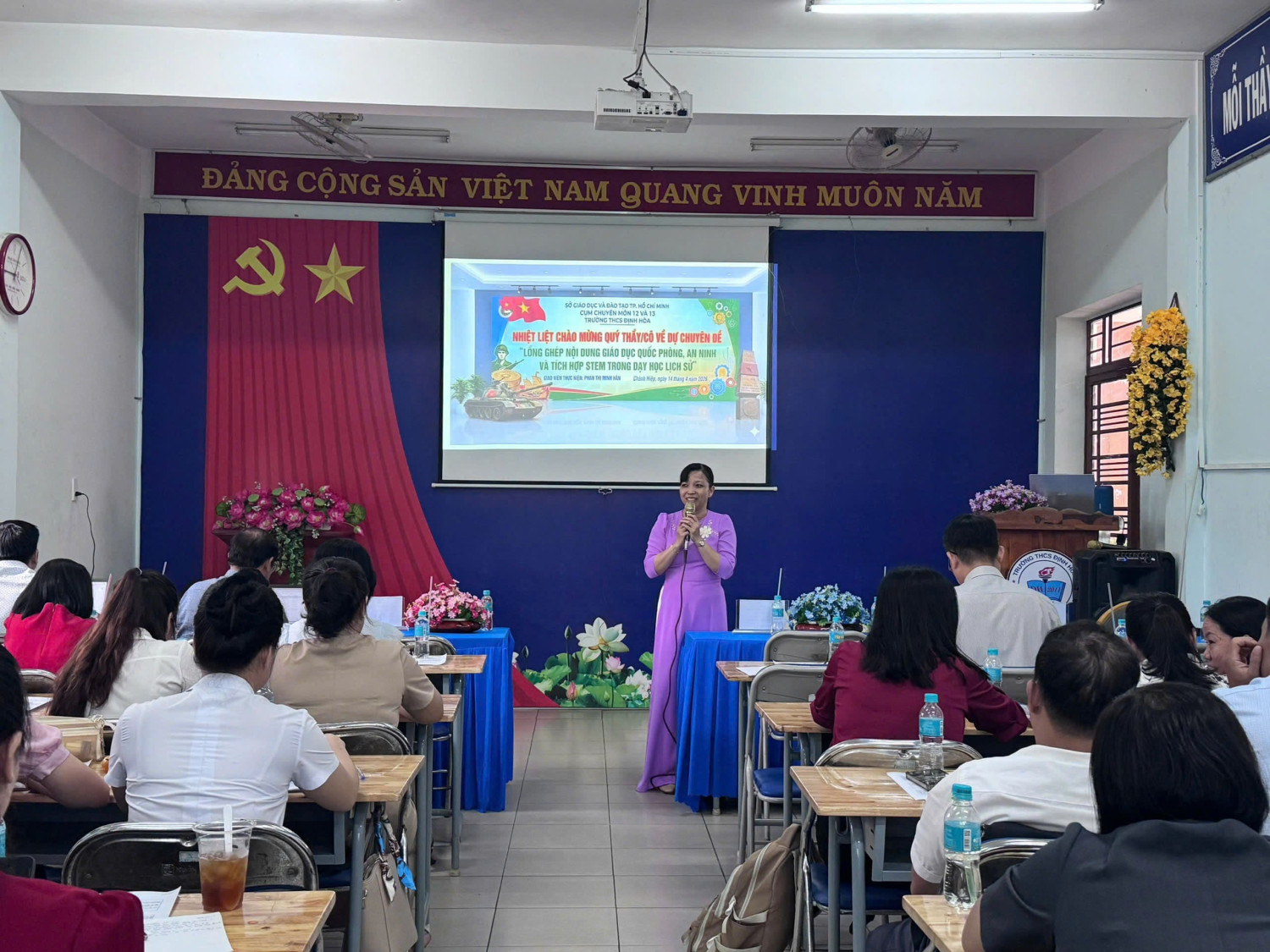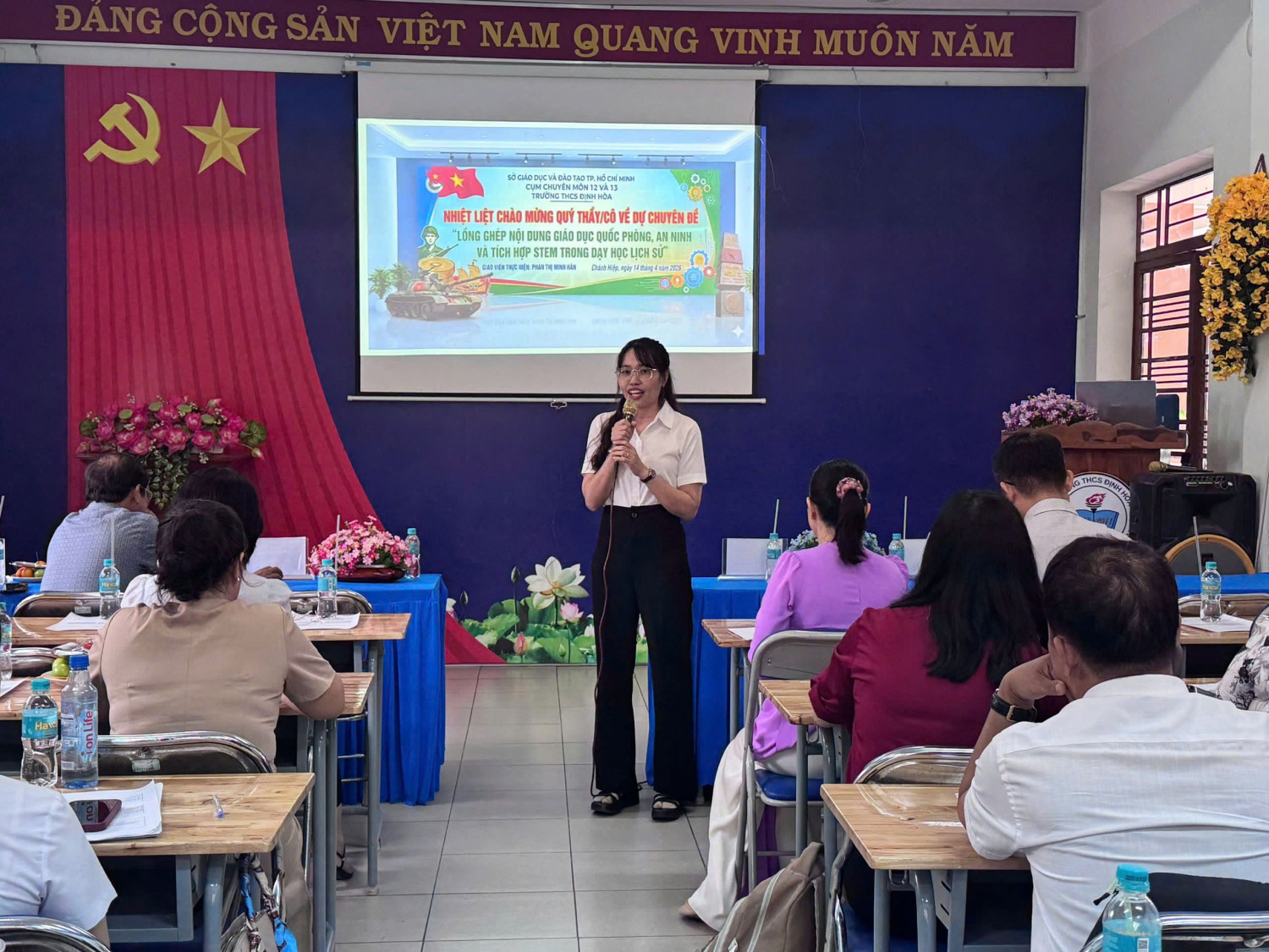 🌸Tại buổi sinh hoạt, giáo viên đã được triển khai các nội dung trọng tâm của Thông tư số 08/2024/TT-BGDĐT về hướng dẫn lồng ghép giáo dục quốc phòng và an ninh trong trường học; đồng thời chia sẻ quy trình thực hiện lồng ghép nội dung giáo dục quốc phòng – an ninh kết hợp tích hợp STEM trong dạy học môn Lịch sử. Nội dung chuyên đề tập trung vào việc đổi mới phương pháp giảng dạy theo định hướng phát triển phẩm chất, năng lực học sinh; tăng cường khả năng vận dụng kiến thức liên môn vào thực tiễn; góp phần giáo dục lòng yêu nước, ý thức trách nhiệm và tinh thần bảo vệ Tổ quốc cho học sinh.
